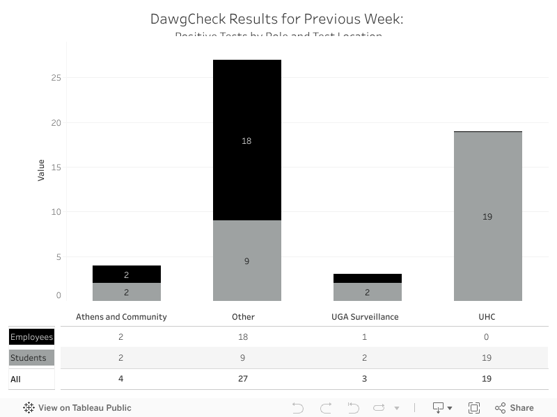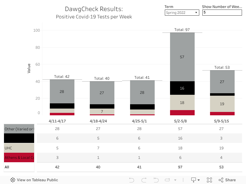 The table below reflects the total number of positive test results reported through DawgCheck each week. It is updated every Wednesday.